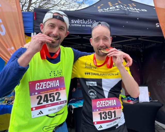 Spolu s Ondřejem po 1/2Maratonu zářil radostí také jeho trasér, profesor Petr Toušek, přednosta Kardiologické kliniky Fakultní nemocnice Královské Vinohrady. „Ondřej ke mně přišel na lékařskou kontrolu, mluvil o svých běžeckých aktivitách, a protože sám sportuji a 1/2Maraton Praha jsem už také několikrát běžel, slovo dalo slovo, a poprvé jsem se postavil na start jako doprovod,“ vysvětloval svou novou roli špičkový lékař. „Závod tak pro mě dostal ještě další rozměr, protože nešlo jen o samotný běh, ale hlavně o to, podpořit Ondřeje, spolu s ním nadchnout lidi pro běhání a ukázat, že handicap není jen překážkou, ale může být naopak obrovskou motivací,“ neskrýval obdiv k nevidomému sportovci význačný kardiolog. Důkazem, že jejich běžecké partnerství má velký potenciál, je i fakt, že tempo a způsob, jakým spolu „půlku“ zdolali, vyhovovaly jim oběma, což je podpořilo v cestě za dalším společným cílem. Letos v listopadu chtějí uběhnout nejstarší, nejtradičnější a nejlegendárnější dvaačtyřicetikilometrový závod na světě, maraton v Athénách.