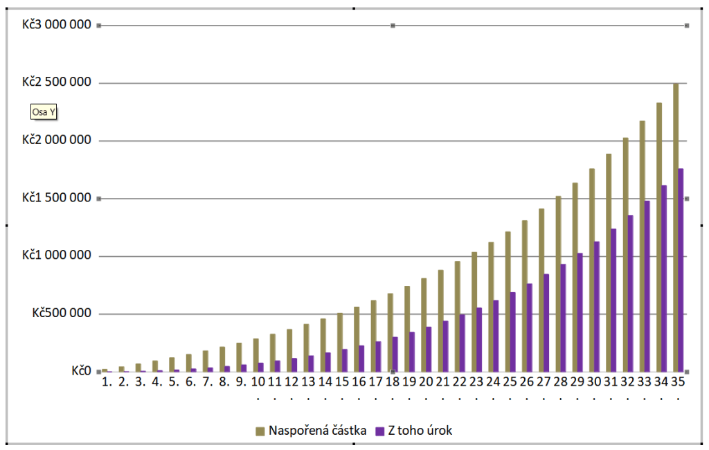 Například v případě třicetiletého člověka se mzdou 35 tisíc korun, což je částka zaostávající za stávajícím průměrem i mediánem mezd v ČR, by odkládání pouhých 5 % příjmu každý měsíc, tedy 1 750 Kč, znamenalo ve stáří výslednou sumu kolem 2,5 milionu korun.