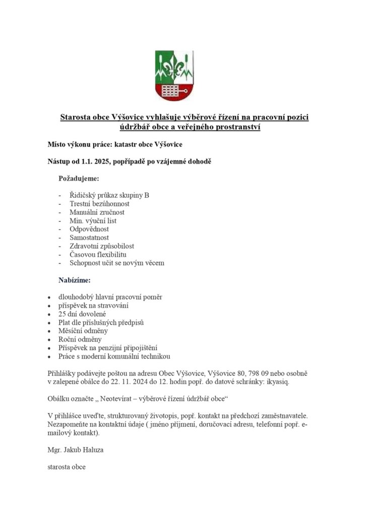 Aktuality, Němčice nad Hanou Výběrové řízení na pracovní pozici – údržbář obce a veřejného prostranství Výšovice (06.11.2024) Date: 6.11.2024Author: paveldf 0 Komentáře Sdílej: Klikněte pro sdílení na X (Otevře se v novém okně) X Sdílet na Facebooku (Otevře se v novém okně) Sdílet na Facebooku Líbí Načítání... Související