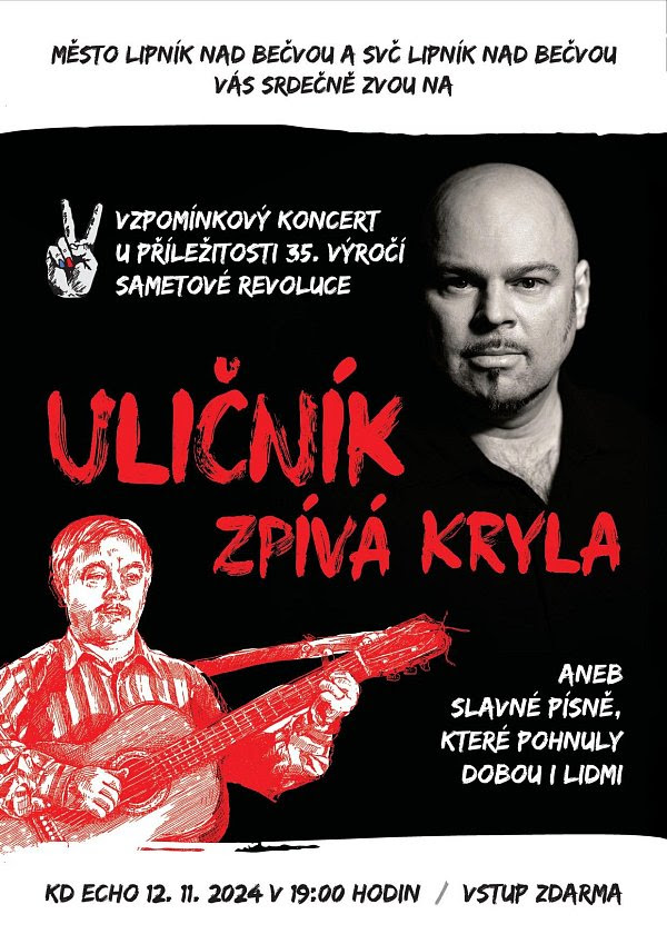 Město Lipník nad Bečvou a SVČ Lipník nad Bečvou zvou v úterý 12. listopadu do kulturního domu Echo na vzpomínkový koncert k 35. výročí sametové revoluce. Vystoupí David Uličník s pásmem písní Karla Kryla. Začátek v 19:00 hodin, vstup zdarma.