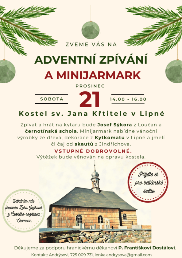Akce, Potštát Adventní zpívání v kostele v Lipné a minijarmark (Potštát) 21.12.2024 Date: 25.11.2024Author: paveldf 0 Komentáře Sdílej: Klikněte pro sdílení na X (Otevře se v novém okně) X Sdílet na Facebooku (Otevře se v novém okně) Sdílet na Facebooku Líbí Načítání... Související