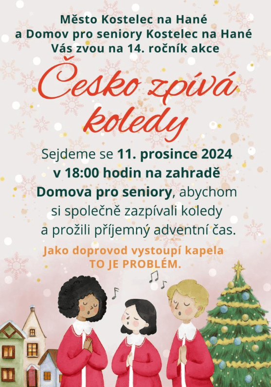 Město Kostelec na Hané a Domov pro seniory Kostelec na Hané Vás zvou na 14. ročník Česko zpívá koledy, který se uskuteční ve středu 11.12.2024 v 18.00 hodin na zahradě Domova pro seniory.