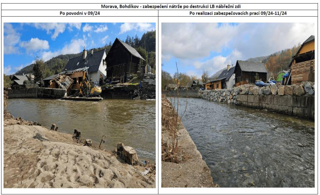 Vodní toky na Šumpersku a jejich okolí bylo před třemi měsíci silně poškozeno povodní, kdy průtoky dosahovaly výše pětisetleté povodně. Po měsících usilovné práce jsou již opětovně ve všech lokalitách koryta vodních toků zprůtočněná a dokončené jsou také rozsáhlé práce na poškozených břehových porostech (odstranění podemletých stromů a vývratů). Současně jsou již také zajištěné poškozené břehy v místech, kde nově vymletá koryta řek ohrožovala nemovitosti, silnice a infrastrukturu. Jednalo se například o Petříkov, Ostružnou, Jindřichov, Hanušovice, Bohdíkov, Loučnou nad Desnou, Rapotín, Šumperk a další. Náklady na zabezpečovací práce na korytech vodních toků a vodních dílech přesahují 120 mil. Kč. Cílem podniku je dokončení zabezpečovacích prací do období jarního tání tak, aby byla koryta vodních toků připravena převést zvýšené průtoky.