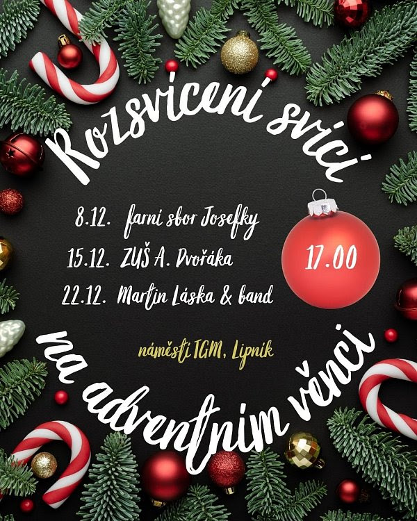 | Zapálení čtvrté svíce na adventním věnci s krátkým koncertem. Vystoupí Martin Láska & band. V neděli 22. prosince na náměstí T. G. Masaryka od 17:00 hodin. |