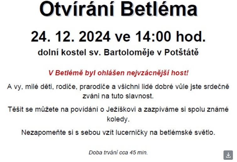 Akce, Potštát Otvírání Betléma (Potštát) 24.12.2024 Date: 17.12.2024Author: paveldf 0 Komentáře Sdílej: Klikněte pro sdílení na X (Otevře se v novém okně) X Sdílet na Facebooku (Otevře se v novém okně) Sdílet na Facebooku Líbí Načítání... Související