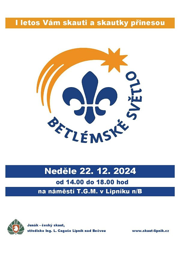 | I letos vám skauti a skautky ze střediska Ing. L. Cagaše přinesou Betlémské světlo. Stane se tak v neděli 22. prosince mezi 14:00 a 18:00 hodinou na náměstí T. G. Masaryka. |
