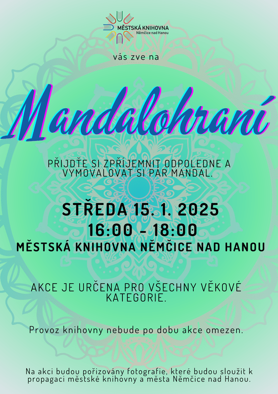 Městská knihovna Němčice nad Hanou Vás zve na Mandalohraní, které se bude konat 15.1.2025 od 16:00 hodin v prostorách městské knihovny.
