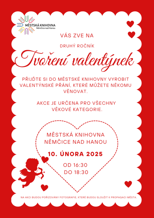 Městská knihovna Vás zve na druhý ročník Tvoření valentýnek, které se bude konat v pondělí 10. února 2025 od 16:30 hodin. Přijďte si vyrobit valentýnské přání, které můžete někomu věnovat.
