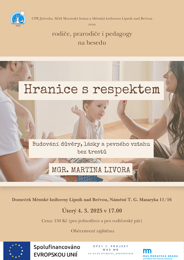 CPR Jitřenka, MAS Moravská brána a Městská knihovna v Lipníku nad Bečvou srdečně zvou širokou veřejnost na besedu Mgr. Martina Livora – Hranice s respektem. Multifunkční sál Domeček, 4. března v 17:00 hodin