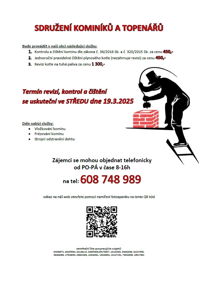 SDRUŽENÍ KOMINÍKŮ A TOPENÁŘŮ nabízí v naší obci služby v oblasti kontroly a čištění komínů a kotlů. Kontrola čištění komínu a čištění plynového kotle proběhne 19. března 2025. Zájemci se mohou objednat telefonicky v pracovní dny. Ceny služeb se pohybují od 450 do 1300 Kč.