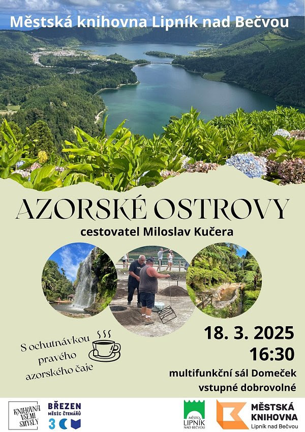 Fascinující přednáška o Azorských ostrovech. Dozvíte se, proč jsou Azory ideální destinací pro milovníky turistiky a dobrodružství v nedotčené přírodě. Zároveň se ponoříte do historie, kultury a přírodních krás tohoto portugalského ráje v Atlantiku. Multifunkční sál Domeček v úterý 18. března od 16:30 hodin, vstupné dobrovolné.