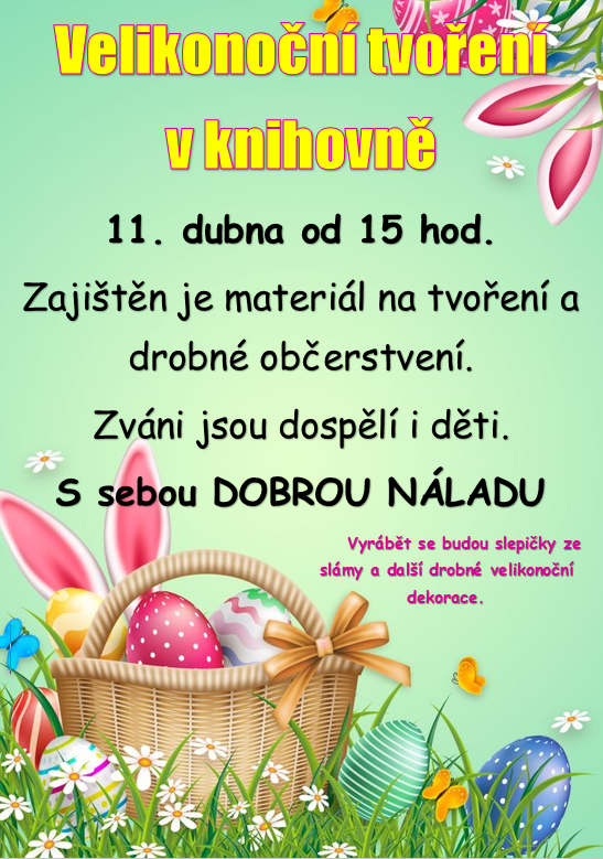 Akce, Potštát Velikonoční tvoření v knihovně (Potštát) 11.04.2025 Date: 13.3.2025Author: paveldf 0 Komentáře Datum konání: 11. 4. 2025 Tuto aktualitu najdete zároveň na www.potstat.cz, kde se můžete podívat i na naše další novinky. Sdílej: Klikněte pro sdílení na X (Otevře se v novém okně) X Sdílet na Facebooku (Otevře se v novém okně) Sdílet na Facebooku Líbí Načítání... Související