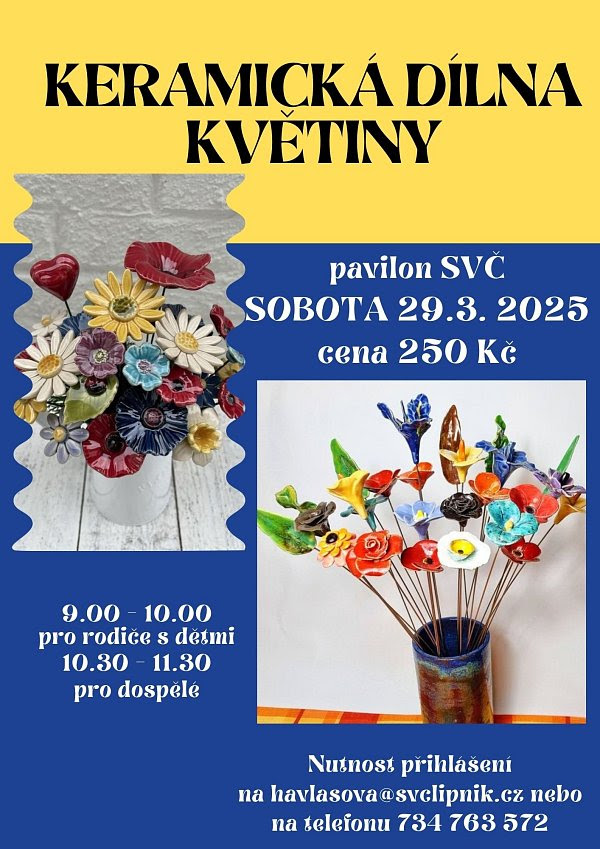 Středisko volného času zve v sobotu 29. března do pavilonu SVČ na keramickou dílnu. Pro děti od 9:00 do 10:00 hodin, pro dospělé od 10:30 do 11:30 hodin. Nutné přihlášení na havlasova@svclipnik.cz nebo na tel.: 734 763 572. Cena 250 Kč.