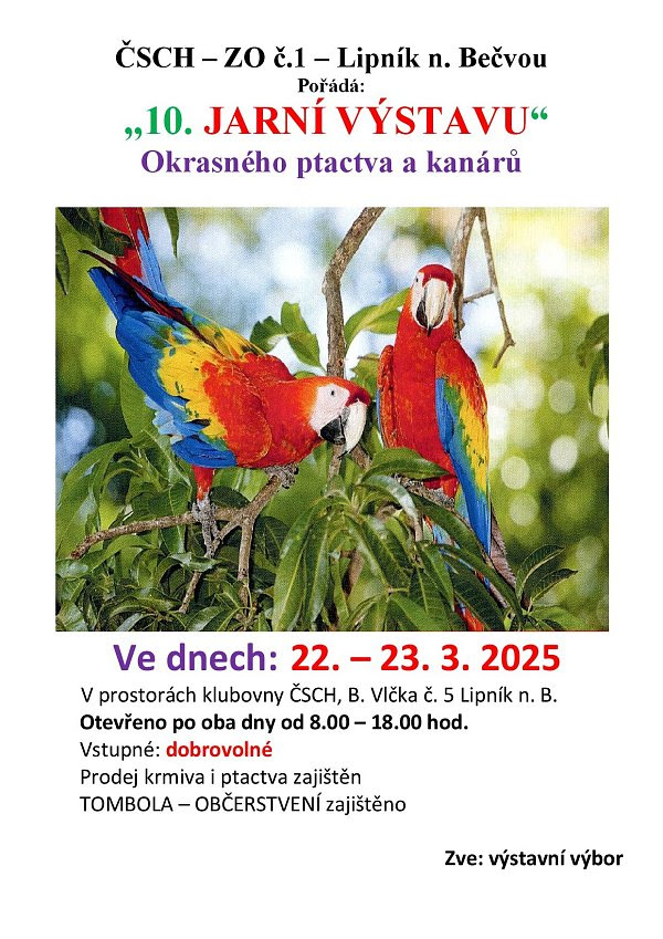 Český svaz chovatelů ZO č.1 zve v sobotu 22. března a v neděli 23. března do klubovny ČSCH v Lipníku nad Bečvou na výstavu okrasného ptactva a kanárů. Otevírací doba po oba dny 8:00 – 18:00 hodin. Vstupné dobrovolné.