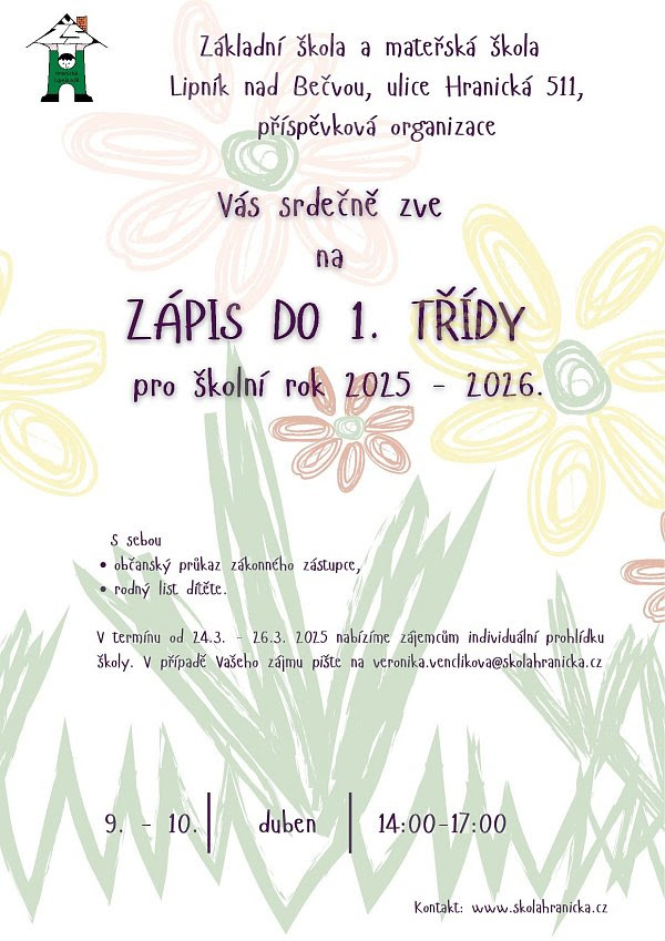 Základní škola a mateřská škola Lipník nad Bečvou, ulice Hranická 511, po zve všechny děti a jejich rodiče ve středu 9. dubna a ve čtvrtek 10. dubna od 14:00 do 17:00 hodin na zápis do 1. třídy.