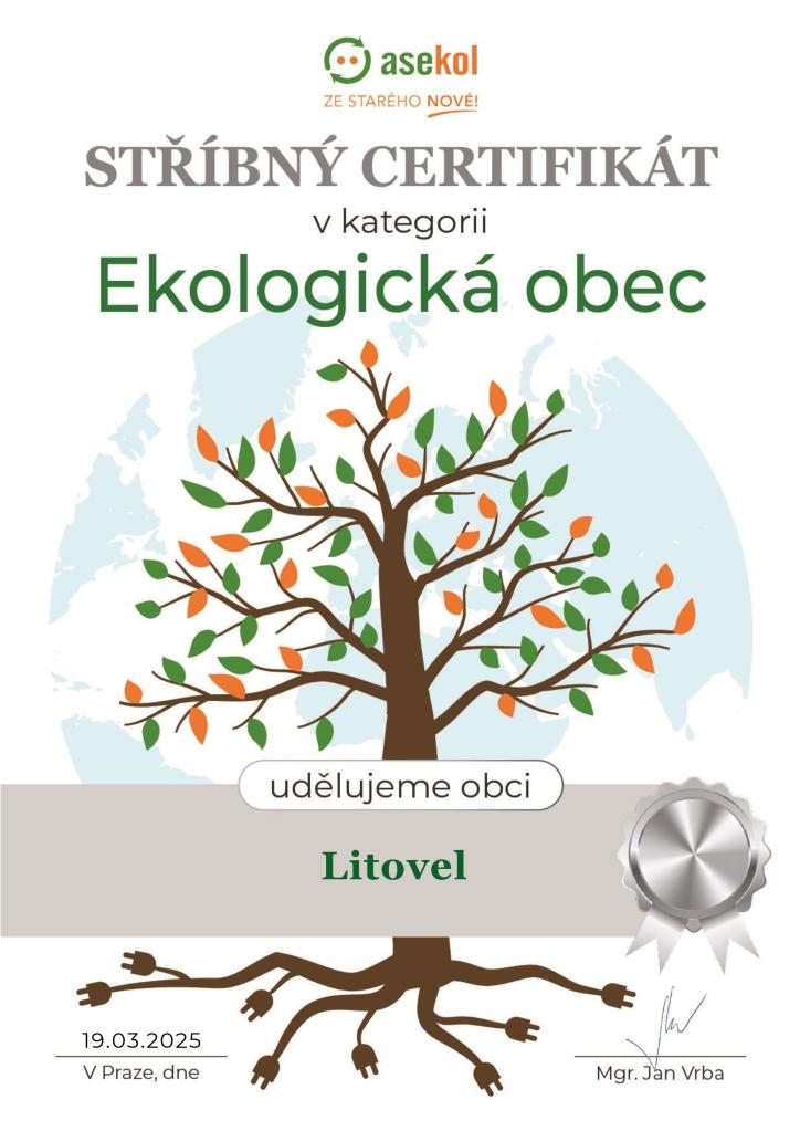 Město Litovel obdrželo od společnosti ASEKOL a.s. stříbrný certifikát Ekologická obec, který je oceněním významného přínosu v oblasti zpětného odběru vysloužilých elektrozařízení. Toto ocenění je důkazem aktivního přístupu k ochraně životního prostředí.