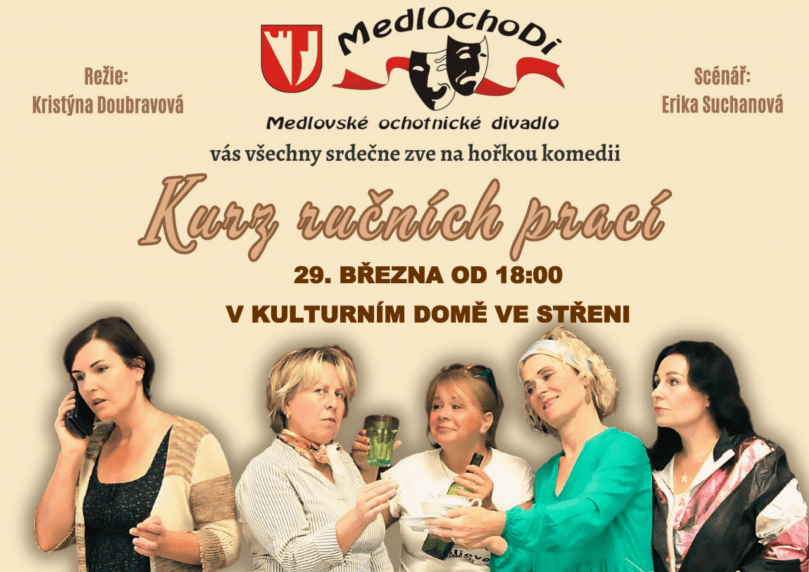 | Medlovské ochotnické divadlo Vás zve do KD ve Střeni na hořkou komedii Kurz ručních prací. |
