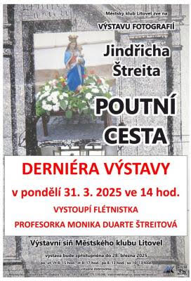 | Derniéra výstavy Poutní cestou ke světlu profesora Jindřicha Štreita proběhne zítra od 14 hodin ve Výstavní síti MK. Těšit se můžete na koncert flétnistky Moniky Duarte Štreitové. Těšíme se na Vás. |