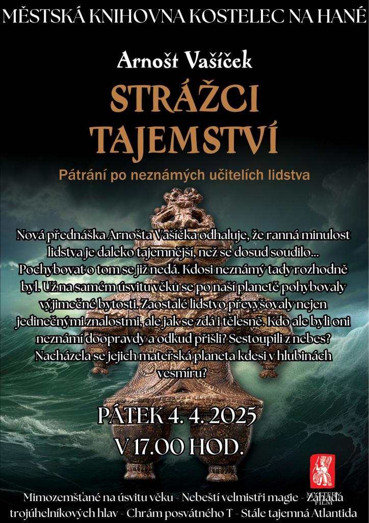 Městská knihovna Kostelec na Hané pořádá přednášku spisovatele a scénáristy Arnošta Vašíčka s názvem: “Strážci tajemství“. Přednáška se uskuteční v pátek 4. dubna od 17.00 hodin.
