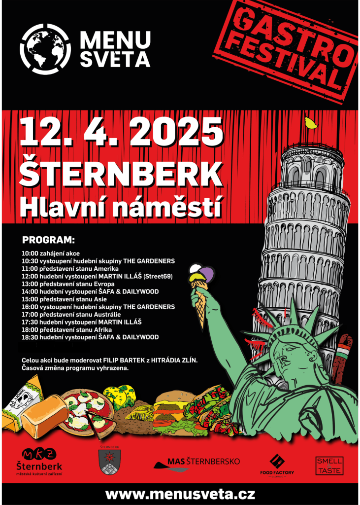Šternberk se 12. dubna stane centrem celosvětových chutí a zážitků. Hlavní náměstí ožije festivalem, který nabídne bohatý program pro milovníky jídla, hudby a cestování. K ochutnání budou gastronomické speciality z pěti kontinentů!
