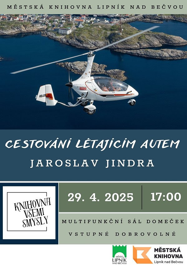 | Přijďte se seznámit s vírníkem, prvním letadlem schváleným do silničního provozu. Objevte svět z ptačí perspektivy na přednášce Jaroslava Jindry v úterý 29. dubna od 17:00 hodin v multifunkčním sále Domeček, vstupní dobrovolné. |