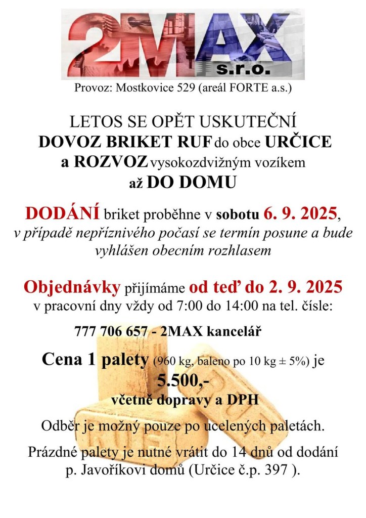 Provozovna FORTE v Mostkovicích oznamuje občanům dodání briket do domu. Dodání se uskuteční 6. září a objednávky přijímají nejpozději do 2. září na tel čísle: 777 706 657