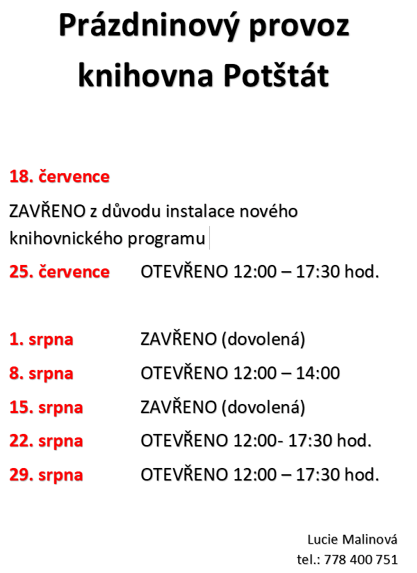Místní knihovna oznamuje čtenářům, že v pátek 18.7. 2025 bude uzavřena.