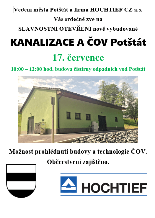 Vedení Města Potštát Vás srdečně zve na slavnostní otevření ČOV, které se koná ve čtvrtek 17.7. 2025 od 10:00-12:00hod. u budovy čistírny odpadních vod Potštát.