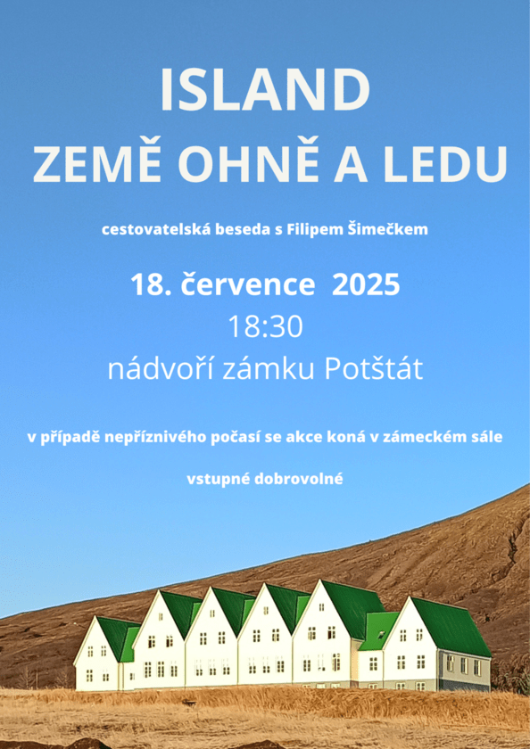 Město Potštát zve všechny občany na besedu o Islandu, která se uskuteční v pátek 18.7.2025 od 18:30 na zámku.