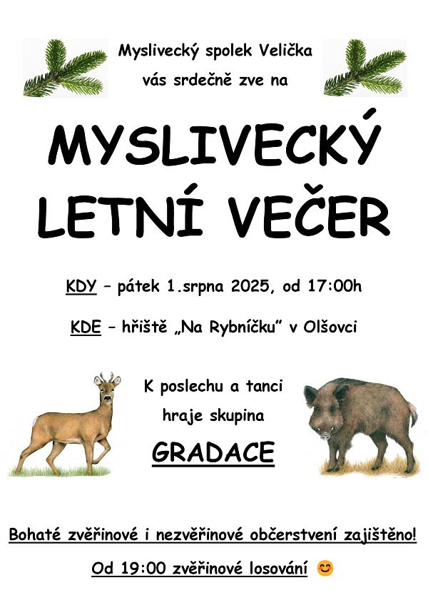 Myslivecký spolek Velička vás srdečně zve na MYSLIVECKÝ LETNÍ VEČER, který se koná v pátek 1. srpna 2025, od 17 hodin na hřišti „Na Rybníčku” v Olšovci.