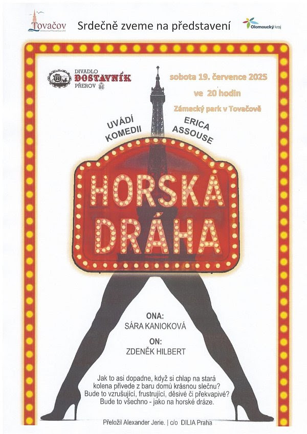 Akce, Tovačov Zpráva z Tovačova (19.07.2025) Date: 19.7.2025Author: paveldf 0 Komentáře Divadlo DOSTAVNÍK Přerov, komedie Horská dráha Zveme vás dnes 19.7. do zámeckého parku na divadelní komedii Horská dráha. Začátek představení je ve 20 h Sdílej: Klikněte pro sdílení na X (Otevře se v novém okně) X Sdílet na Facebooku (Otevře se v novém okně) Sdílet na Facebooku Líbí Načítání... Související