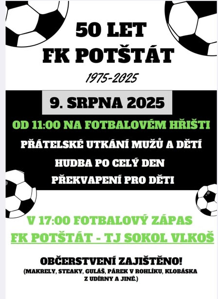 - FK Potštát Vás zve na 50. výročí od založení fotbalového klubu, které se koná v sobotu 9. srpna od 11:00 hod. na fotbalovém hřišti. Těšit se můžete na přátelská fotbalová utkání, hudbu po celý den, překvapení pro děti, výborné občerstvení. Od 17:00 hod. utkání FK Potštát x TJ Sokol Vlkoš. (viz plakát na konci článku)