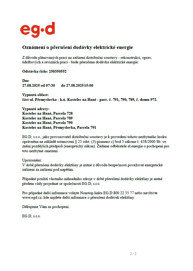 Z důvodu plánovaných prací na zařízení distribuční soustavy – rekonstrukcí, oprav, údržbových a revizních prací – bude ve středu 27. srpna 2025 od 7.30 do 15.00 hodin přerušena dodávka elektrické energie v níže uvedené oblasti.