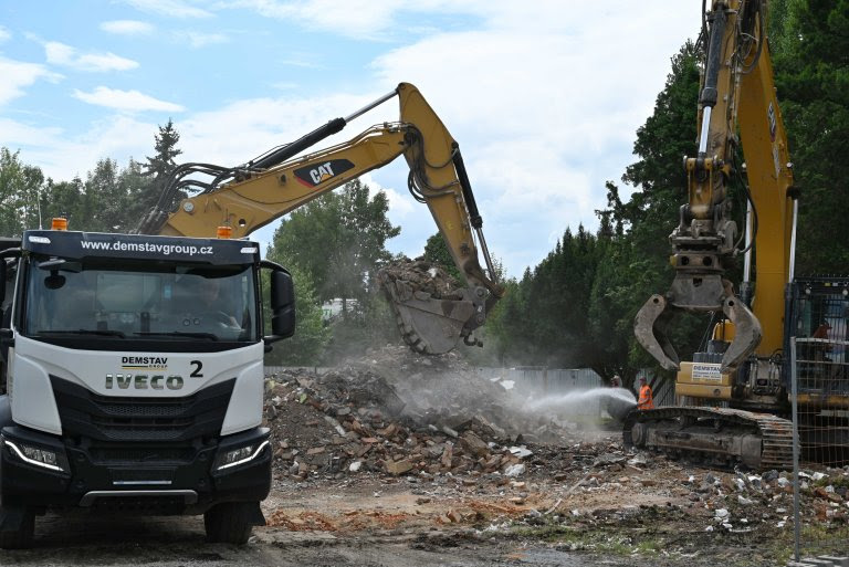 Bývalá ubytovna Vrchlického se již změnila v hromadu sutin, kterou stroje usilovně rozebírají a odvážejí. Zároveň se pracoviště kropí, aby se příliš neprášilo.
