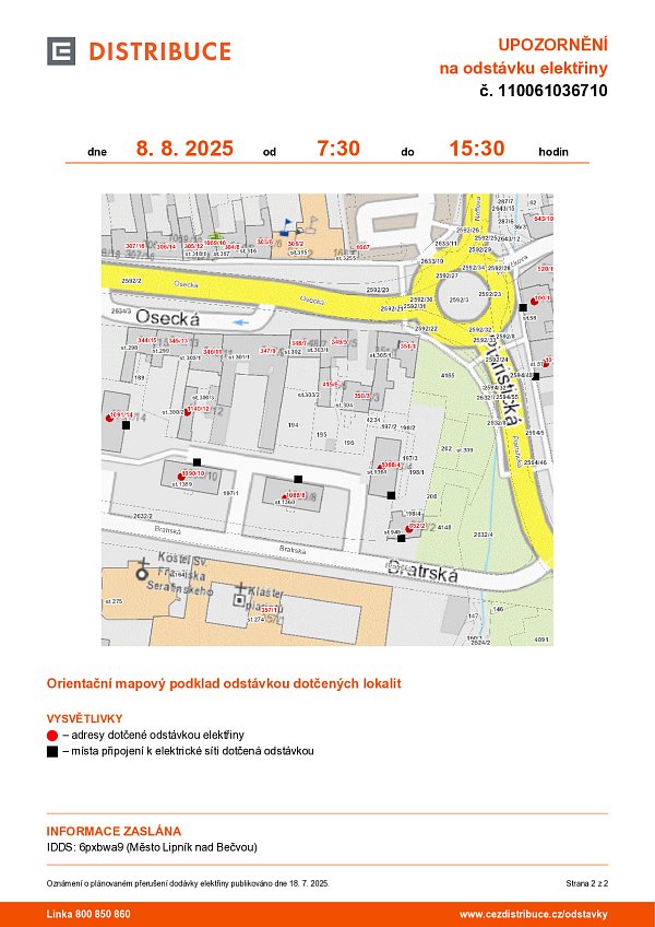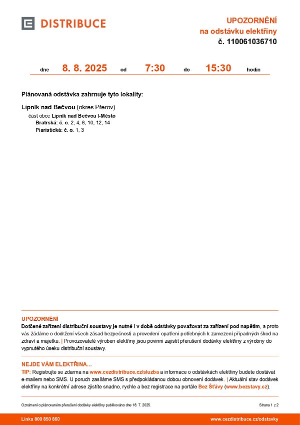 | Dne 8. srpna dojde k plánovanému přerušení dodávky elektřiny v čase od 7:30 do 15:30 hodin z důvodu údržby distribuční sítě. Odstávka se týká ulic Piaristická a Bratrská. |