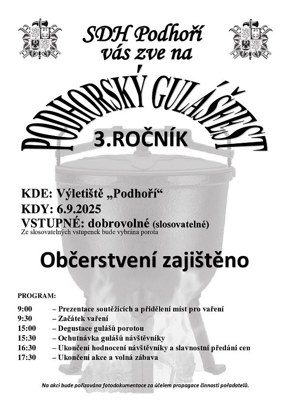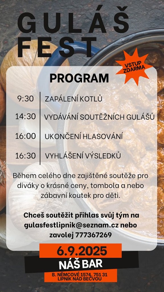 | První zářijovou sobotu 6. 9. se můžete těšit hned na dva Guláš festy. Na již třetí ročník se můžete vydat na výletiště v Podhoří, začátek v 9:00 hodin. Přímo v Lipníku nad Bečvou ho pořádá NÁŠ BAR v ulici B. Němcové, vedle tenisových kurtů od 9:30 hodin. Uzávěrka přihlášek je 31. 8. 2025. Více informací naleznete na přiložených plakátech. |