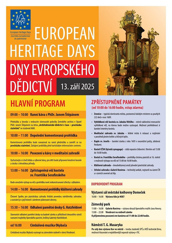 | V sobotu 13. září se naše město připojí k významné celoevropské kulturní akci s názvem Dny evropského dědictví (anglicky European Heritage Days, zkratka EHD), v rámci níž se široké veřejnosti otevírají brány nejzajímavějších památek a objektů, včetně těch, které jsou jindy zčásti nebo zcela nepřístupné. |