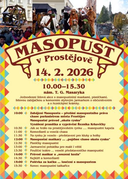 Masopustní veselí se i v letošním roce vrací do centra Prostějova. Tradiční lidová akce plná masek, hudby, tance, dobrého jídla a zábavy pro malé i velké se uskuteční v sobotu 14. února 2026. Návštěvníky čeká pestrý program, který propojí staročeské zvyky s živou atmosférou jarmarku a lidové zabijačky.